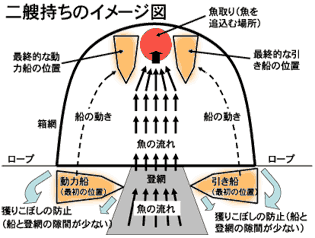 【漁獲2】 地域内漁業者の多くが一艘持ち(一隻の船による操業)であるところを、二艘持ち(動力船+引き船)による漁法を行っている。 一艘持ち漁法の場合、登網と船との間隔が大きくなるが、二艘持ち漁法の場合は船と登網との隙間が少なくなり、効率の良い漁獲につながっている。