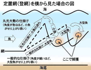 【漁獲1】 従来では市場に出回ることのなかった小魚を効率良く確保するために、仕掛けの角度を調整。 魚の習性を利用した仕掛けで効率的な小魚確保が可能となった。また、これまで市場に出回らなかったタカベに市場価格が付けられたことで魚価が全体的に上がり、地域内漁業者の収入増加の一助となっている。 魚の習性…小魚は「群れる習性」と、「狭い所に集まる習性」が強い。角度が急な仕掛けの場合、水面と仕掛けの間が狭くなり、狭い所に集まる習性から、特に小魚が集まり、更に、群れる習性から続けて網の中に入ってくる。