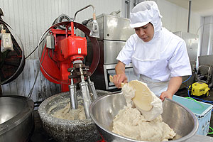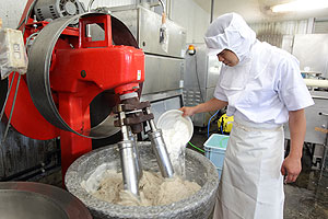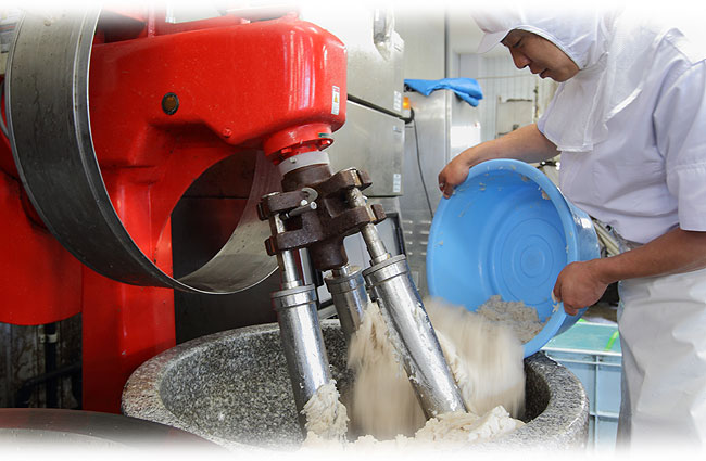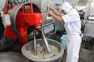 かまぼこづくりは、すり上げの作業。 熟練者がすり上がりの様子を確認しながら進めて行きます。 美味しいかまぼこが生まれるように丹誠込めて。