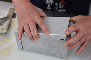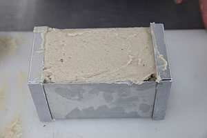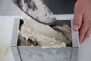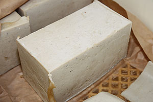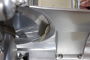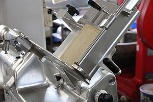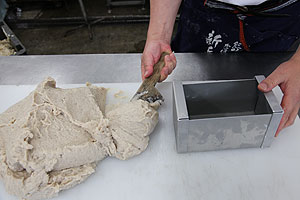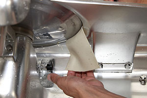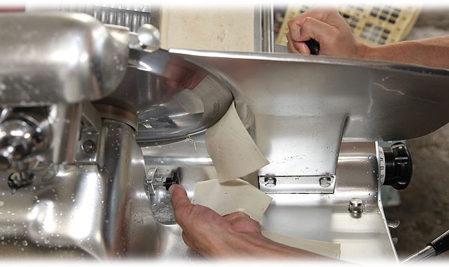 いよいよ最終仕上げ。 スライスにできるかまぼこ作りは試行錯誤の末、 もっとも良い練り具合を見つけ生まれました。